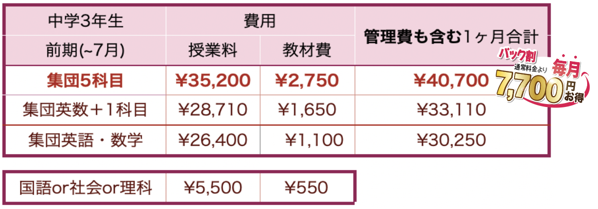 ※5•10•1月に塾内模試(全国模試)代として4,400円(税込)がかかります。